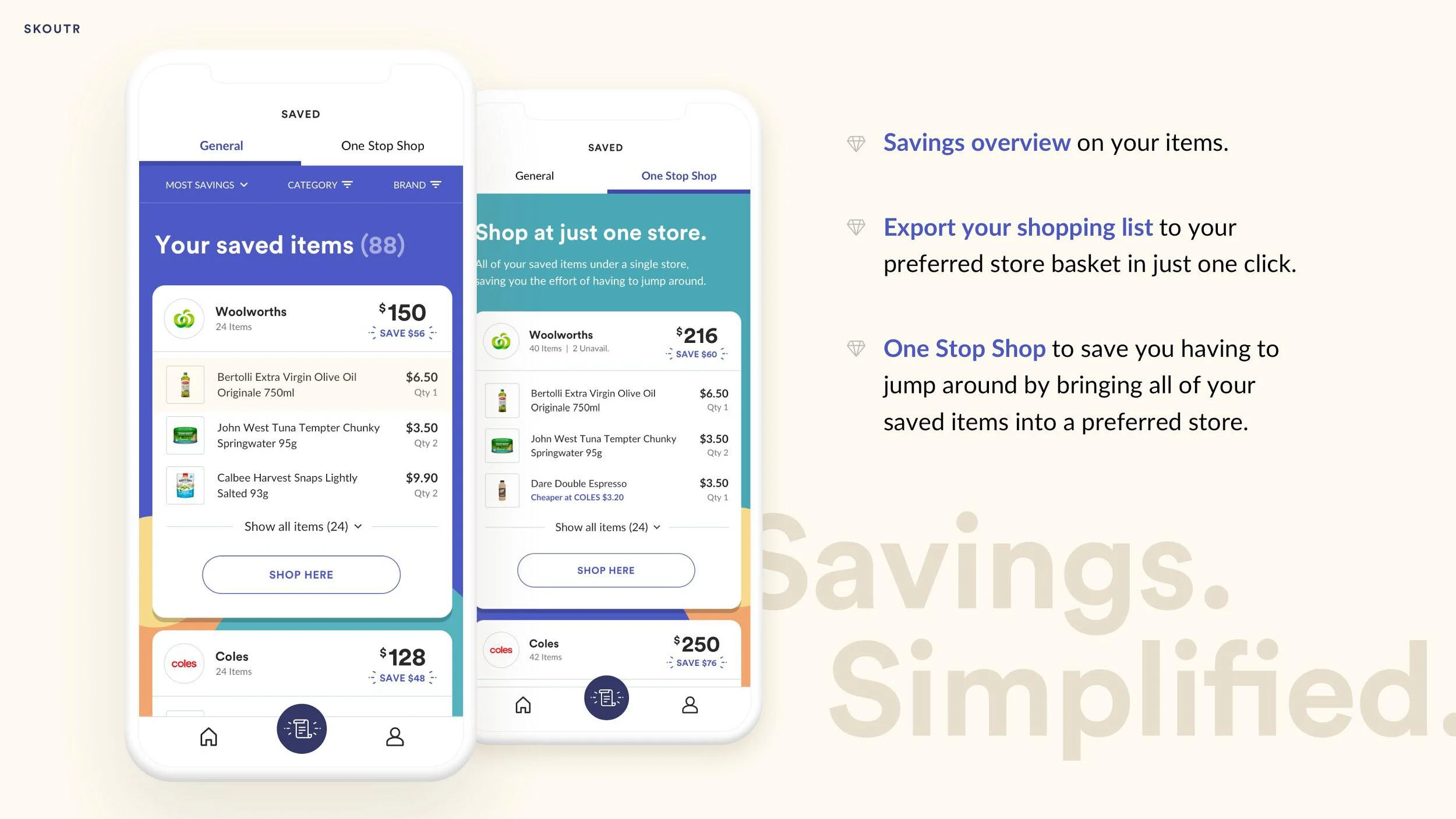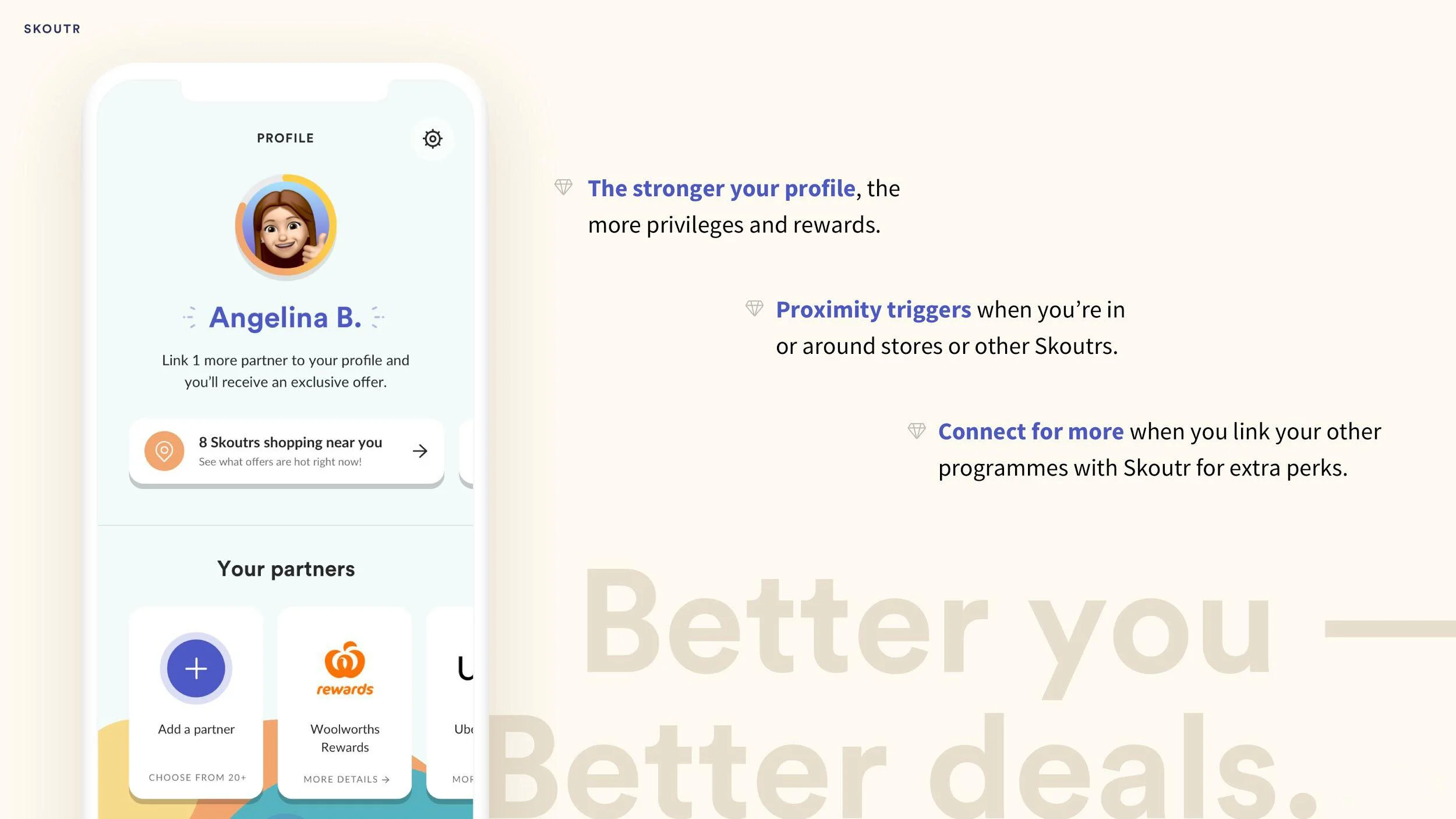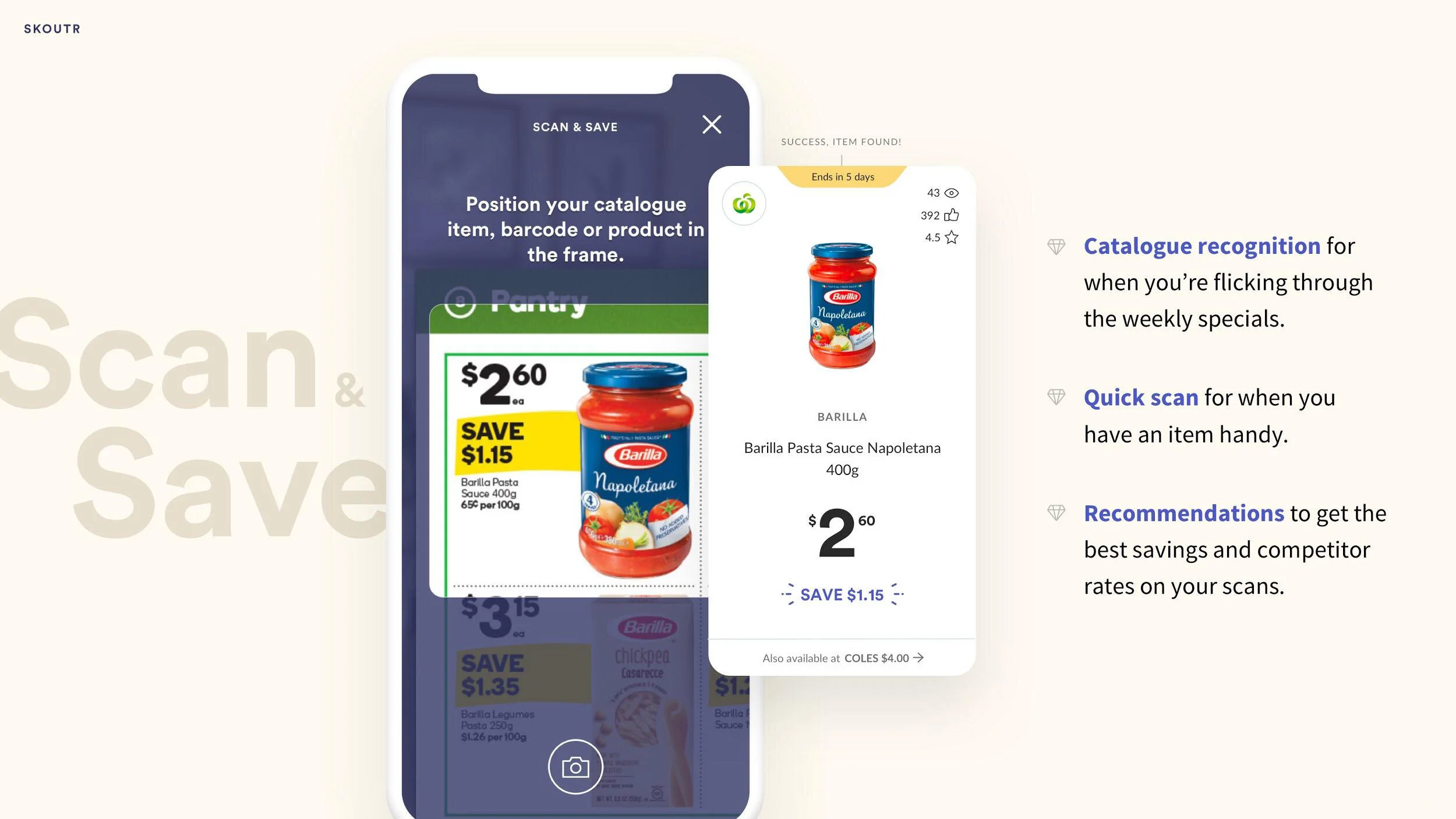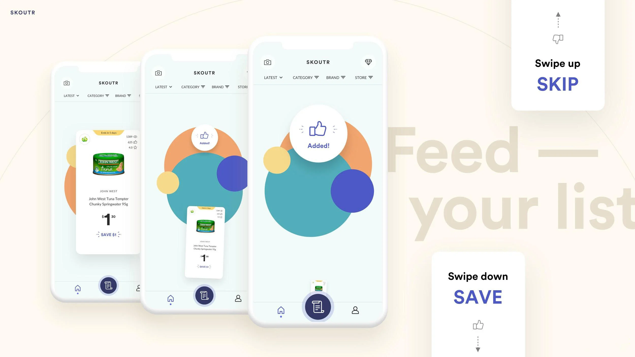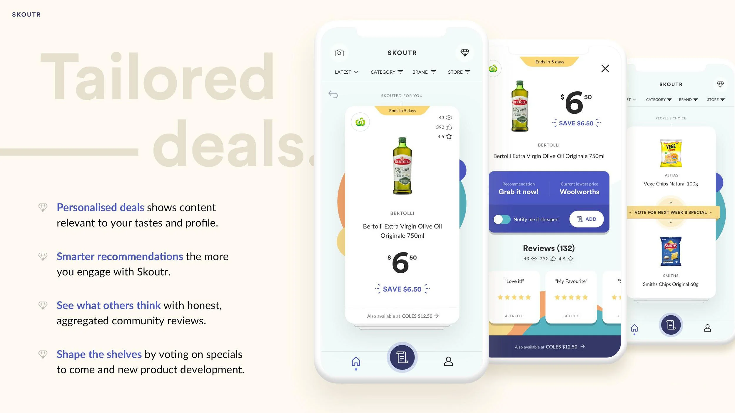 A digital product that allows users to navigate through personalised deals based on their shopping preferences. Users are able to simply swipe up to dismiss an offer, or swipe down to save it to their list. The platform allows for third party vendors to surface offers, ensuring Woolworths utilise the rich data to better deliver content to the right user. The product also utilises gamification and community based strategies to ensure the user has a hook and need to continually revisit the app.